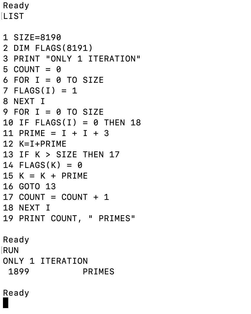 Not the fastest kid on the block ... 133 seconds to run the Sieve of Eratosthenes. Although, looking back to the historical BYTE article, it looks like it beat the pants off pretty much all of the interpreters at the time.