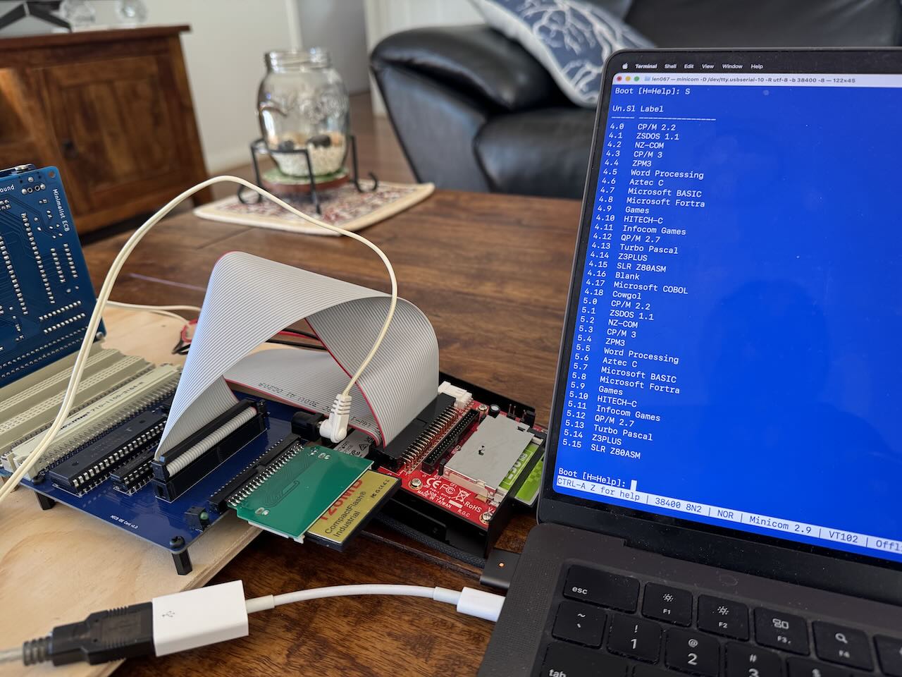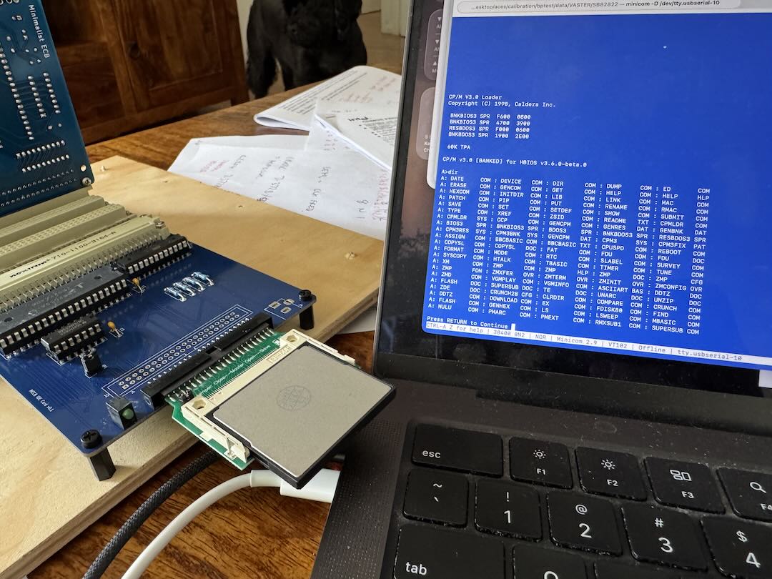 Anyway, the first prototype of the IDE interface appears to be running with RomWBW and the Z80 board (it is based on the RC2014 equivalent). I tested it with a compact FLASH to IDE adapter, the FLASH card has the RomWBW "combo" disk image. I tested booting CP/M 3 off it and that seemed to work OK. I wanted to have a right-angle IDE header so that I could plug the FLASH adapter on top (so it doesn't interfere with other cards when it is in the upright position) but it turns out that I had the connector the wrong way around - it didn't really matter as the IDE adapter doesn't have a guide on top (like the right-angle header has) - but it does have a "key" i.e. blocked pin in the socket to ensure the adapter is plugged in the right way around. I think the PCB-mount LEDs I purchased may also be the wrong way around compared to what I expected so the activity light on the board isn't lighting up (though activity is still shown on the FLASH card adapter). I haven't tested the standard 40-pin IDE yet. I may need another adapter to test that as I don't have any IDE drives.
