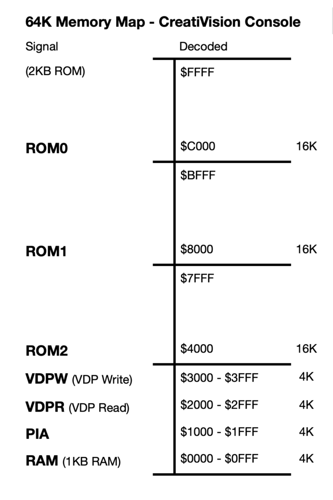 Note also, that the remaining address range, (from $1000 – $3FFF), is used by the CreatiVision for mapping its I/O.